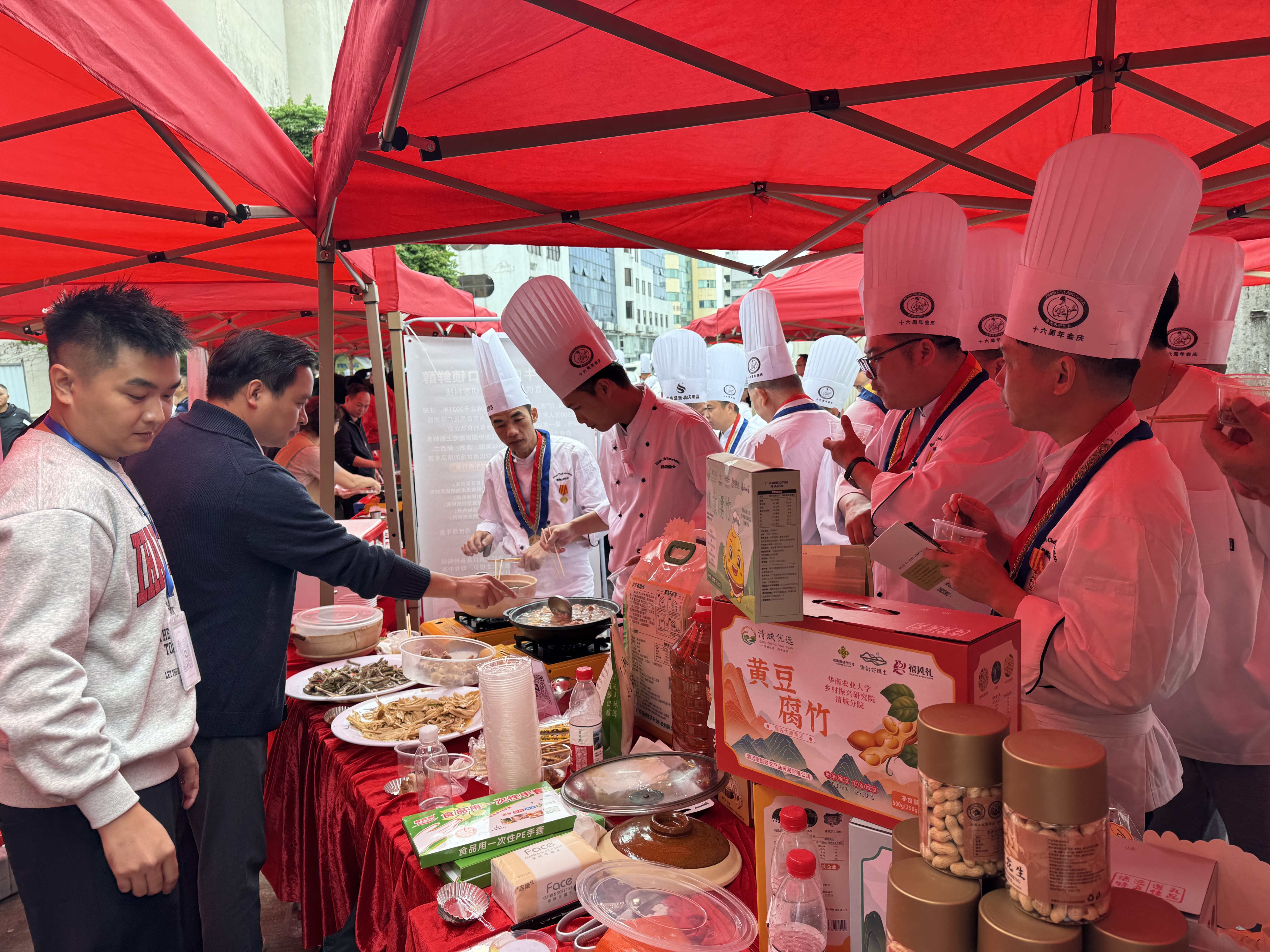 活动现场展销区人气十足,各个摊位前都围满了前来试吃品鉴、交流洽谈的餐饮代表。作为参展企业之一,清城区供销合作社下属全资子公司——清远市振联农产品贸易有限公司集中展示 “清城优选” 系列农产品,有与华南农业大学联合研发的高钙腐竹、儿童腐竹,还有清远鸡、乌鬃鹅等特色禽畜,以及禧凤礼传统土炸花生油、供销丝苗米等日常食材。
