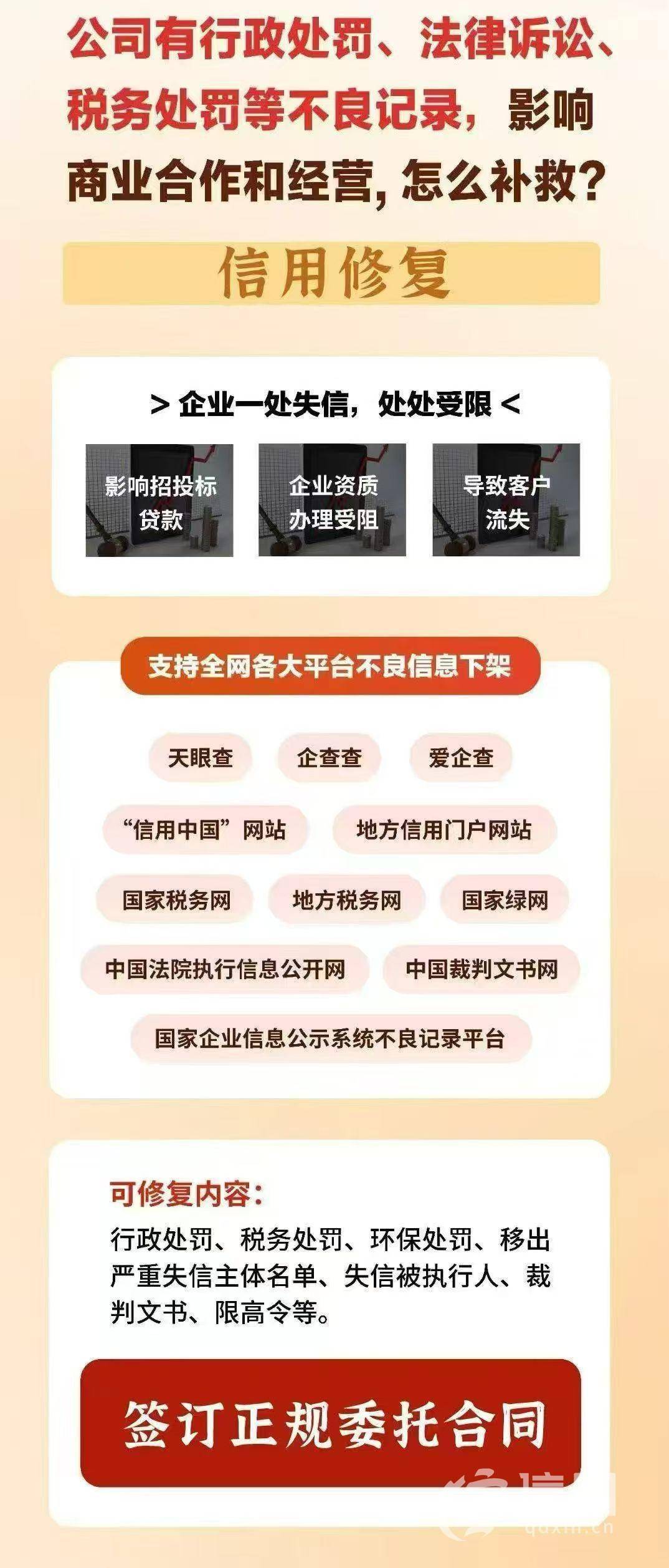 信网9月23日讯 在社交平台上发布“喜报”,用中国裁判文书网的截图来证明自己有进行企业修复的能力,还在视频里称“消除司法案件记录只需20个工作日”。在市场监管部门鼓励违法失信当事人主动纠正违法失信行为的同时,也有人盯上了这一行当,通过社交平台“引流”,用所谓的“有关系”,进行有偿信用修复。信网(热线0532-80889431)在采访中了解到,无论是行政处罚还是司法文书的撤销都要经过严格的审核,根据案件情况不同各有条件。而且,根据国家市场监总局发布的《市场监督管理信用修复管理办法》,明确规定“严禁在信用修复管理中收取任何费用”。