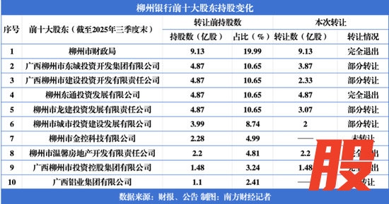 根据公告,本次股权转让的核心标的,主要来自柳州银行前十大股东的股权划转。具体来看,此次股权转让中,4家股东选择完全退出,分别是柳州市财政局(持有9.13亿股)、柳州东通投资发展有限公司(持有4.87亿股)、柳州市温馨房地产开发有限责任公司(持有2.2亿股)、广西柳州市投资控股集团有限公司(持有1.48亿股)均转让全部持股,彻底退出前十大股东行列。